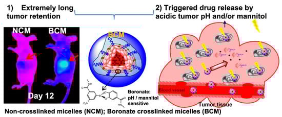 Polymeric micelles can be modified for stimuli responsiveness and active targeting for cancer drug delivery. Depending on the manufacturing method, they can be used as a carrier of hydrophilic or hydrophobic drugs, specifically in chemotherapy. GeneXol-PM® was approved by the FDA in 2007 as a polyethylene glycol (PEG)-PLA-based polymeric micelle, which is a carrier of PTX and is effective in treating breast cancer and lung cancer [71,72]. Anti-cancer effects or physicochemical properties can be improved via the modification of micelles or conjugation. Cavalcante et al. developed pH-sensitive micelles in order to enhance antitumor activity and reduce toxicity [73]. DSPE-PEG2000, oleic acid, and DOX were used to manufacture micelles. Oleic acid forms an ion pair with the DOX amine group at pH 7.4. As oleic acid becomes protonated at pH 5 or lower pH, the ion pair is unpaired, and the micelle becomes unstable, resulting in the release of DOX. Upon examining the release profile of DOX for 24 h, approximately 30% and 60% of DOX were released at pH 7 and pH 5, respectively. When the tumor size was compared to that of the control group, the micelles comprising the ion-pair of DOX with oleic acid were significantly smaller. In the case of micelles without the ion-pair of DOX and oleic acid, an anticancer effect was observed; however, the difference was not significant when free DOX was used. These observations suggest that the ion pair of DOX and oleic acid releases DOX in response to pH. Xiao et al. developed boronate cross-linked micelles (BCM) that demonstrated an extremely long tumor retention period. BCM showed much better stability than the non-crosslinked micelles [74]. Furthermore, BCM showed excellent stability under in vitro conditions in the plasma at physiological pH but lost their structure under acidic pH and the addition of mannitol (Figure 3). BCMs were retained in the tumors for 12 days after drug administration, and the size of the tumor and tumor-associated mortality were statistically reduced.