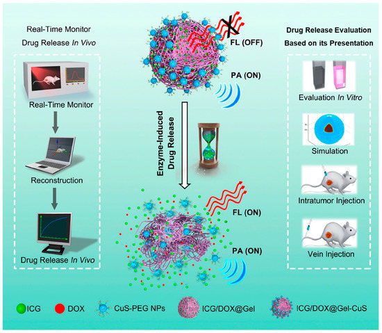 The anticancer DDS that can react with enzymes and control the release of DOX was developed by using cystamine-modified gelatin [63]. Oil-in-water microemulsion containing cystamine-modified gelatin, Fe3O4, and DOX were prepared for delivery by utilizing the EPR effect at the tumor site. Cystamine-modified gelatin released DOX, which was in response to glutathione (GSH) and matrix metalloproteinase (MMP). Since the amount of GSH and MMP is overexpressed in cancer tissues compared to that in normal tissues, the developed microemulsion can control the release of DOX in cancer tissues. Controlled drug releases induced by GSH and MMP improved tumor therapy and drug monitoring using T2 magnetic resonance imaging (MRI) were possible due to the properties of Fe3O4. While the drug release was regulated by enzymes, monitoring the drug concentration was important for determining the efficiency and prognosis of cancer treatment. Core-satellite nanomedicines for accurate real-time monitoring of enzyme-induced drug release were also developed [64]. This nanomedicine was developed using DOX and indocyanine green (ICG), which acted as medical diagnostics and were loaded with surrounding CuS nanoparticles (ICG/DOX@Gel-CuS nanomedicines). CuS nanoparticles (NPs) generate a photoacoustic signal independent of the physical status of the ICG/DOX@Gel-CuS nanomedicines (NMs). This independent property aids in the real-time tracking of nanomedicines. In contrast, ICG fluorescence depends on the physical status of ICG/DOX@Gel-CuS NMs. The stable state of ICG/DOX@Gel-CuS NMs results in quenching and interference with ICG fluorescence. ICG/DOX@Gel-CuS nanomedicines and the controlled release of DOX were monitored up to 24 h. The application of ICG/DOX@Gel-CuS NMs resulted in significantly reduced tumor sizes without toxicity (Scheme 1).