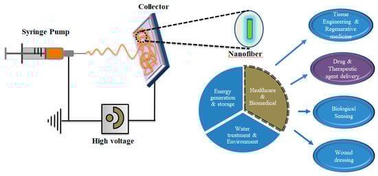 Schematic illustration of a traditional electrospinning process and various healthcare and biomedical applications of nanofibers (reproduced from [142], MDPI 2019).