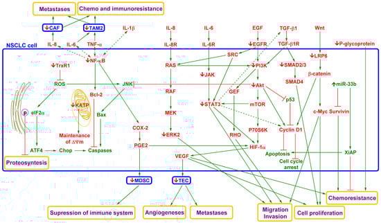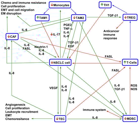 Simplified model of curcumin and flavonoids effects on the NSCLC microenvironment [83,119,148,158,159,162,168,170,174,175,186,187,188,189,190,191,192,193,194,195,196]. A necessary part of igenesis and CTC spreading is the interaction of NSCLC cells with tumour-associated cells. NSCLC cells recruit monocytes via IL-17 into tumour tissue. Signalling factors (e.g., IL-6, IL-8, TNF-α, and PGE2) produced in the tumour microenvironment stimulate monocyte differentiation into TAM2 (which support NSCLC cell proliferation, EMT, chemoresistance and immune resistance, and EM disruption). MDSCs recruited via IL-8 and TGF-β1 repress the cytotoxic effects of T cells against NSCLC cells and induce their differentiation into Treg cells that are responsible for the suppression of the host immune response. VEGF-recruited TECs affect EMT, chemoresistance, and the proliferation of NSCLC cells, recruit MDSCs and induce angiogenesis. IL-8-activated CAFs decrease the anticancer immune response (with the support of TAM2 and MDSCs) and repress T cells. CAFs stimulate EMT and induce NSCLC cell proliferation, migration, and drug resistance. Tumour-associated cells help sustain the tumour microenvironment and aggressive metastatic phenotype. TAM2, CAFs, and TECs are co-inducers of EMT and thereby CTC spreading, chemoresistance, and immune resistance. MDSCs and Treg cells repress the host immune response and thereby support CTC survival in the blood. Nevertheless, the anticancer effect of curcuminoids and flavonoids is not dependent on targeting of NSCLC cells, as they repress other important parts of the complex tumour ecosystem. The application of such agents is associated with stimulation of the immune system (higher levels of TAM1 and T cells; lower levels of Th1 cells, TAM2, and Treg cells; and lower recruitment of monocytes and MDSCs). Curcuminoids and flavonoids also decrease the levels of CAFs and TECs and repress their interaction with NSCLC cells. In addition, the application of curcuminoids and flavonoids leads to a decrease in the proliferation, survival, chemoresistance, immunoresistance, and migration ability of NSCLC cells. CAF, cancer-associated fibroblast; EM, extracellular matrix; EMT, epithelial–mesenchymal transition; EGF, endothelial growth factor; FasL, Fas ligand; IL-1β, interleukin 1β; IL-6, interleukin 6; IL-8, interleukin 8; PGE2, prostaglandin E2; NOS, nitric oxide species; ROS, reactive oxygen species; TAM1, tumour-associated macrophage M1; TAM2, tumour-associated macrophage M2; TEC, tumour endothelial cell; TGF-β1, transforming growth factor beta 1; Th1, T helper 1; Treg, regulatory T; TNF-α, tumour necrosis factor alpha; VEGF, vascular endothelial growth factor. Green arrow = induction/activation of factor/phenomenon/cell; red arrow = repression/inhibition of factor/phenomenon/cell; blue arrow = differentiation of immune cells; ↑ = curcumin/flavonoids activation/induction; ↓ = curcumin/flavonoids repression/inhibition.