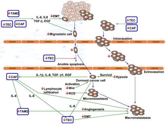 Knowledge about MErT is still limited. Several studies suggest that E-cadherin overexpression, which enables CTCs to adhere to target tissue and survive within ectopic metastatic microenvironments, is key in the MErT process [221,225,226,227]. MErT can also be significantly influenced by the presence of TAMs. Yang et al. reported that the M1 TAM phenotype can support MErT by stimulating E-cadherin expression and thereby enhance cancer cell colonization [228]. Infiltrating cancer cells that penetrate healthy tissues can likely survive in the dormant state even with a lower metabolic load. Their eradication is complicated.
