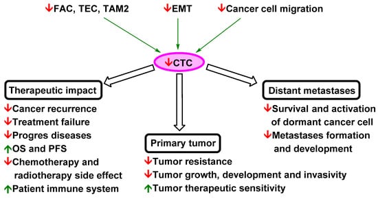 CTC spreading from tumours is not an isolated phenomenon but a central part of the complex process underlying the development of metastases. Tumour-associated cells can support CTC metastatic activity in several ways. As part of the tumour microenvironment, they can induce an aggressive metastatic phenotype with high production of CTCs (e.g., an EMT phenotype), protect CTCs in the bloodstream, and assist in metastasis formation (see the next subchapter). These phenomena suggest that repressing tumour-associated cells could be an important part of CTC targeting. For example, higher lymphocyte infiltration in breast cancer patients was associated with higher CTC counts and metastatic relapse [197]. Additionally, higher Treg cell levels and neutrophil-to-lymphocyte ratios can induce CTC spreading [198,199]. CTCs in clusters with CAFs display higher survival in the bloodstream [135]. Osmundski et al. found that TAM-associated macrophages can stimulate an aggressive phenotype of prostrate CTCs, including high adherence and plasticity [200]. In breast cancer, a decrease in CD8+ T cells and IFN-γ can lead to an increase in the CTC count [201]. On the other hand, activated NK cells can repress metastasis via CTC killing [202].