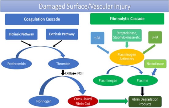 - Altaf, F.; Wu, S.; Kasim, V. Role of fibrinolytic enzymes in anti-thrombosis therapy. Front. Mol. Biosci. 2021, 8, 680397. [Google Scholar] [CrossRef] [PubMed]