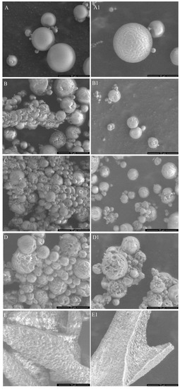 Morphology of the drug-free microspheres (MS) (A–E) and the microspheres (MS) loaded with epothilone B (EpoB) and rapamycin (Rap) (A1–E1), obtained from PLA 100/PLA–PEG 0 (A,A1), PLA 75/PLA–PEG 25 (B,B1), PLA 50/PLA–PEG 50 (C,C1), PLA 25/PLA–PEG 75 (D,D1), PLA 0/PLA–PEG 100 (E,E1).