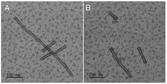In the study, the micelles were formed from PLA–PEG and MS were prepared from five kinds of materials (PLA or a mixture of PLA and PLA–PEG) (Table 1). The MS obtained from PLA 0/PLA–PEG 100 formed clusters (Figure 1E,E1) and the process of their preparation was very inefficient, so they were excluded from further analysis. The other four kinds of MS (PLA 100/PLA–PEG 0, PLA 75/PLA–PEG 25, PLA 50/PLA–PEG 50, and PLA 25/PLA–PEG 75) were characterized by a spherical shape and the morphology did not change after drug loading (Figure 1). However, some differences in the morphology of MS were observed, because PLA formed solid particles with a smooth surface (Figure 1A,A1) and MS obtained from a mixture of PLA and PLA–PEG were characterized by a less compact structure. A correlation between the number of MS with a loosened structure and the amount of PLA–PEG was found, so they were in a majority in PLA 25/PLA–PEG 75 MS (Figure 1D,D1). Apparently, the addition of hydrophilic PLA–PEG to highly hydrophobic PLA changed the structure of the microparticles. All kinds of the MS were of a similar size, which ranged from 2.47 μm (PLA 25/PLA–PEG 75) to 3.76 μm (PLA 100/PLA–PEG 0) (Figure 1). It is worth noting that the diameter of the MS was below 10 μm, which is considered too large for phagocytosis [34]. Contrary to the round shape of the MS, PLA–PEG formed particles of an elongated shape approximately 10 nm in diameter and >200 nm in length (Figure 2).
