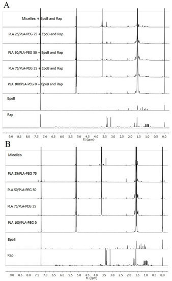 The presence of drugs in the MS and micelles was confirmed using NMR spectroscopy. Comparison of NMR spectra of free drugs and dual drug-loaded DDSs or free drugs and drug-free DDSs is presented in Figure 3A,B, respectively. Signals assigned with the CH (5.3 ppm) and CH3 (1.6 ppm) groups of PLA are visible in spectra obtained for drug-free and drug-loaded DDSs. In the spectra obtained for the DDSs prepared from a mixture of PLA and PLA–PEG, CH2 groups of PEG are also identified at 3.6 ppm. Moreover, the signals of drugs are observed in the spectra of DDSs containing drugs. The signals assigned to CH3 groups of Rap are identified in all kinds of the Rap-loaded carriers at 0.95–1.11 ppm. In addition, CH3 groups of EpoB are visible in the spectra of EpoB-loaded DDS at 1.3 ppm.