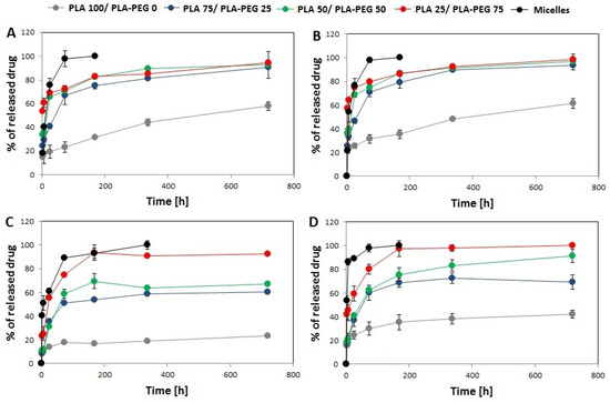 The results of in vitro drug release from the single- and dual drug-loaded DDSs are presented in the Figure 4. In all kinds of DDS, the release rate was dependent on polymer composition, so proceeded the fastest from PLA–PEG micelles (100% of drug released until 168 h) and the slowest from PLA 100/PLA–PEG 0 MS (58% of Rap and 61% of EpoB released from single drug-loaded MS after 720 h, and 23% of Rap and 42% of EpoB released from dual-drug loaded MS). The differences in drug release rate between DDSs were more significant in the case of dual drug-loaded DDSs (Figure 1C,D). The release of Rap and EpoB from single drug-loaded PLA 75/PLA–PEG 25, PLA 50/PLA–PEG 50. and PLA 25/PLA–PEG 75 proceeded with a similar rate. However, all kinds of DDS were characterized by a faster release of drugs than single drug-loaded DDS in comparison to the Rap and EpoB co-loaded DDSs.