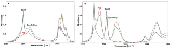 The FTIR spectra of rapamycin (Rap), epothilone B (EpoB), and a mixture of them (A,B).