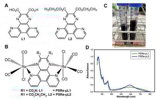 Chemical structure of the Re(I) bimetallic photosensitizer compounds and their L ligands and absorption spectra. The chemical structure of Re(I) complexes show the L1 and L2 ligands (A) and the (Re(CO)3Cl)2µ-N^N, whose replacement of R1 results in the PSRe-µL1 and PSRe-µL2 compounds (B). Macroscopic appearance of PSRe-µL1 and PSRe-µL2 compounds concentrated in solution at 2 mg/mL (C). The absorption spectra for the PSRe-µL1 and PSRe-µL2 compounds in acetonitrile solution (D).