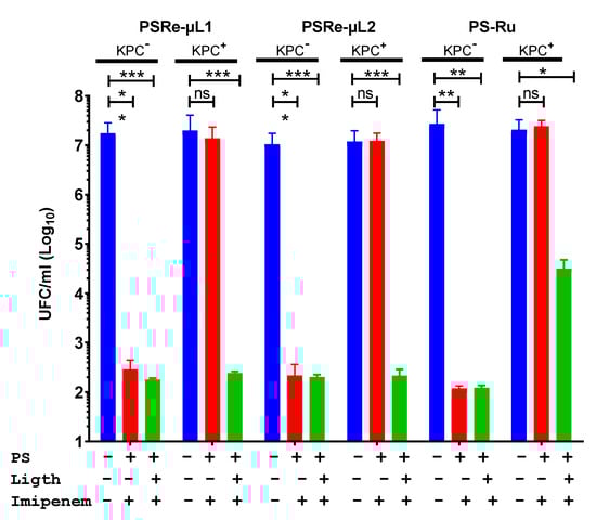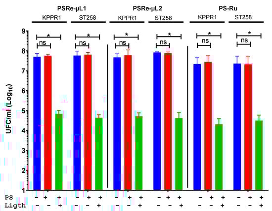 The Photodynamic antimicrobial inhibition of PSRe-µL1 and PSRe-µL2 compounds. The imipenem-sensitive strain (KPPR1) and the imipenem resistant strain (ST258) of K. pneumoniae were used at a 1 × 107 CFU/mL and mixed in triplicate with 16 µg/mL of PSRe-µL1, PSRe-µL2, or PS-Ru compounds. The mix was incubated for 1 h at 17 µW/cm2 with light for aPDI (green bars) or in the dark for controls (red bars). The results were compared to control of bacteria not combined with the PSs (blue bars). Colony count enumerated viable bacteria on ca-MH agar after serial micro-dilution. The CFU/mL values are presented as means ± SD on a log10 scale. The + and − signs indicate the presence or absence of a compound or condition. Not significant (ns) p > 0.05 by Student’s t-test among bacteria treated with PS without light compared to untreated control bacteria; * p < 0.05 by Student’s t-test among bacteria treated with PS exposed to light compared to untreated control bacteria.
