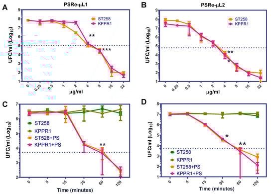 Determination of minimum effective concentration and time lethality. The minimum effective concentration (MEC) and lethality of the PSRe-µL1 and PSRe-µL2 were determined using the imipenem-sensitive (KPPR1) and the imipenem resistant (ST258) strains of K. pneumoniae. For MEC determination, bacteria at 1 × 107 CFU/mL were incubated with increasing concentrations (0–32 µg/mL) of the compounds PSRe-µL1 (A) or PSRe-µL2 (B) and exposed for 1 h to 17 µW/cm2 of white LED light. The time lethality was determined, mixing the bacteria with 4 µg/mL of PSRe-µL1 (C) or PSRe-µL2 (D), and exposure for increasing times (5, 15, 30, 60, and 120 min) to 17 µW/cm2 of white LED light. Colony count enumerated viable bacteria on ca-MH agar after serial-microdilution. The CFU/mL values are presented as means ± SD on a log10 scale (* p < 0.05, ** p < 0.01, *** p < 0.001 by Student’s t-test among bacteria treated with PS exposed to light compared to untreated control bacteria).