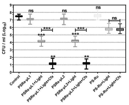 We have in our laboratory a collection of 118 clinical isolates of K. pneumoniae from patients who had an active infection [42]. We used these isolates to verify the photodynamic activity of the PSRe-µL1 and PSRe-µL2 compounds on community bacteria and compared them with PS-Ru positive control [49]. As seen in Figure 5, photodynamic treatment with 4 µg/mL PSRe-µL1 or PSRe-µL2 significantly (*** p < 0.001; compared to untreated control) inhibits bacterial growth > 3log10 (>99.9%) of clinical isolates of K. pneumoniae. The results show that the bactericidal effect produced by PSRe-µL1 and PSRe-µL2 is light-dependent (ns = p > 0.05; compared to the untreated control). Those results are comparable with the positive control PS-Ru (4 µg/mL) (*** p < 0.001). Because this collection of strains has been characterized by its resistance profile and presents 66 ESBL-producing isolates, we analyzed whether a synergic effect occurred with cefotaxime. It was first determined whether the combined treatment with Cfx increases the inhibition of bacterial growth of aPDI with PSRe-µL1 or PSRe-µL2. The clinical isolates were exposed to the preparation of 4 µg/mL of cefotaxime with 4 µg/mL of PSRe-µL1 or PSRe-µL2. As expected, the PSs compounds mixed with cefotaxime significantly (*** p < 0.001) increased the bactericidal effect on the clinical isolate population from 3 to 6log10 reduction (Figure 5). No significantly increased inhibitory effect was observed for the PS-Ru control combined with cefotaxime (ns p > 0.05).