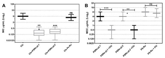 Determination of FIC index using combined photodynamic inactivation and cefotaxime antibiotic. A population of 66 ESBL-producing clinical isolates of K. pneumoniae was used to determine the modification on Cfx-MIC by the PSs and the modification in PSs-MECs by cefotaxime. To determine the Cfx-MIC modification, 1 × 107 CFU/mL of bacteria were mixed in triplicate with 4 µg/mL of PSRe-µL1, PSRe-µL2, or PS-Ru. The mix was added to serial dilutions of Cfx and incubated for 1 h with 17 µW/cm2 of white light or in the dark. The Cfx-MIC was then determined after 16–20 h at 37 °C in the dark (A). The MEC for PSRe-µL1 and PSRe-µL2 were determined in combination with 4 µg/mL of Cfx, performed in triplicate in ca-MH agar for 16–20 h (B). The MIC values are presented as median ± SD of µg/mL on a log2 scale. Not significant (ns) p > 0.05 by Student’s t-test among treated bacteria compared to control; * p < 0.05, ** p < 0.01, *** p < 0.001 by Student’s t-test among treated bacteria compared to control.