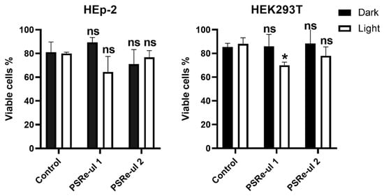 The PSRe-µL1 and PSRe-µL2 compounds were tested in vitro and found to be secure for mammalian cells. This work tested the intrinsic cytotoxicity (dark cytotoxicity) and light-dependent cytotoxicity of the PSs compounds in the human HEp-2 and HEK293 cell lines. The trypan blue exclusion technique allowed us to determine cell death of 500,000 cells in the presence of 4 µg/mL PSRe-µL1 or PSRe-µL2. The cells were incubated with PSs for 1 h in the dark or activated with 17 µW/cm2 of white LED light when the PSs were removed. Fresh medium DMEM with 10% FBS without PS was replaced, and cells were incubated 24 h more in the dark at 37 °C in a 5% CO2 atmosphere. As shown in Figure 7, when HEp-2 and HEK293T cells were exposed to 4 µg/mL of PSRe-µL1 or PSRe-µL2 in the dark, no significant reduction in the cell survival was observed (ns = p > 0.05, Student’s t-test, comparing treated cells with the control). Similarly, the light exposition induced no significant cell death for HEp-2 cells, although a slight (12.5 ± 5%) but significant (p > 0.05) reduction in cell viability of PSRe-µL1 over HEK293T cells were shown.