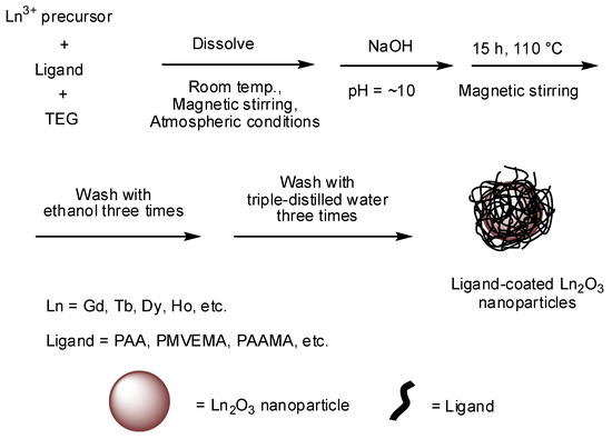 Among the various methods currently available for the synthesis of ultrasmall Ln2O3 nanoparticles, the synthesis in a polyol solvent is preferred for biomedical applications because ultrasmall nanoparticles are obtained (average particle diameter = 2.0 nm) and subsequent surface coating of the nanoparticles with hydrophilic and biocompatible ligands can be performed in one pot [17,31]. A general reaction scheme for the polyol synthesis is provided in Figure 1.