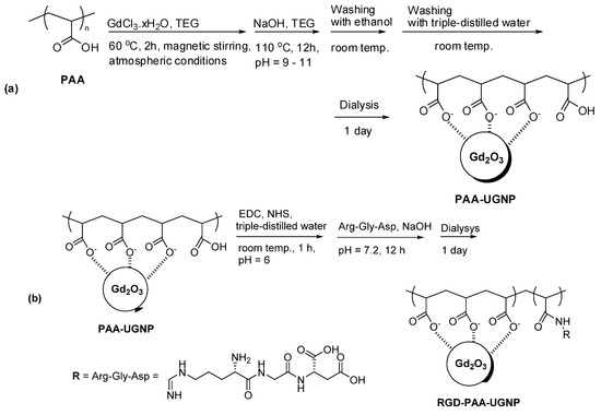 Two-step synthesis of RGD-PAA-Gd2O3 nanoparticles. (a) Step 1: PAA-Gd2O3 nanoparticles and (b) step 2: conjugation of RGD with PAA-Gd2O3 nanoparticles. EDC = N-(3-dimethylaminopropyl)-N′-ethylcarbodiimide, NHS = N-hydroxysuccinimide, and UGNP = ultrasmall gadolinium oxide nanoparticle. Adapted with permission from [44], The Royal Society of Chemistry, 2020.