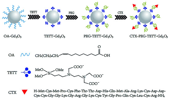 Schematic illustration for the synthesis of CTX-PEG-TETT-Gd2O3 nanoparticles. TETT = N-(trimethoxysilylpropyl) ethylenediamine triacetic acid trisodium salt and OA = oleic acid. Reproduced from [45], The Royal Society of Chemistry, 2014.