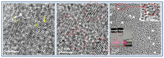 (a–c) HRTEM images [44,47,48]. Arrows and circles indicate nanoparticles. Insets in (c) show a magnified image of a nanoparticle (top right) and laser light scattering (i.e., Tyndall effect) due to the collision of the nanoparticle colloids with a passing laser light, whereas triple-distilled water shows no light scattering, confirming the good colloidal dispersion of nanoparticles in aqueous media (bottom left). Reproduced from [44,47,48]. Copyright 2020 The Royal Society of Chemistry [44]; Copyrights 2018 Wiley [47,48].