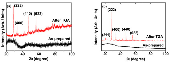 Due to the ultrasmall particle diameters, the XRD patterns of nanoparticle powder samples are generally broad and amorphous [49,50]. Nevertheless, upon performing a TGA from room temperature to high temperatures (>500 °C), sharp peaks corresponding to the (222), (400), (440), and (622) planes of a highly crystallized form of Ln2O3 having cubic structure are observed [50]. Examples of XRD patterns of ligand-coated Gd2O3 nanoparticles recorded before (i.e., as-prepared) and after TGA [44,47] are provided in Figure 5. The peak positions and the estimated cell constants of the TGA-analyzed samples are well consistent with those given in the literature [51]. The sharp peaks observed in the XRD patterns after TGA are due to the particle size growth and subsequent crystallization of the nanoparticles (Figure 5a,b), which was confirmed by Kattel et al. on the basis of HRTEM images [50,52].