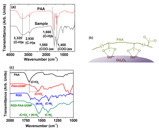 (a) FT-IR absorption spectra of PAA-coated Gd2O3 nanoparticles and free PAA sodium salt (Mw = 5100 Da) and (b) surface-coating structure of PAA on the Gd2O3 nanoparticle surface [39]. (c) FT-IR absorption spectra of PAA (Mw = 1800 Da), PAA-Gd2O3 nanoparticles, RGD, and RGD-PAA-Gd2O3 nanoparticles [44]. The lowercase letters “s”, “ss”, “as”, and “b” indicate stretch, symmetric stretch, antisymmetric stretch, and bend, respectively. Adapted from [39,44]. Copyrights 2018 and 2020 The Royal Society of Chemistry, respectively.