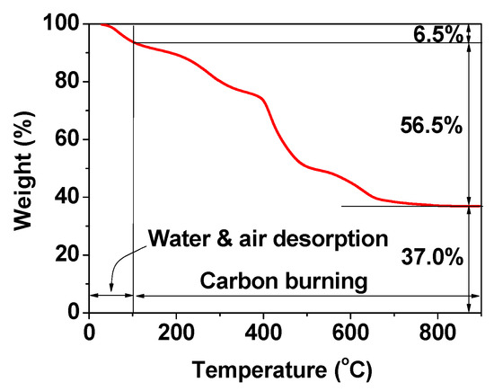 The EA can also be used to investigate the surface coating of nanoparticles. For example, in carbon-coated Gd2O3 nanoparticles (C@Gd2O3), the C/H/O content, in which H mostly stems from hydrocarbons and -OH groups and O mostly stems from -OH groups on the carbon-coating layer, was determined to be 28.1/3.2/26.5 in wt% [57]. The sum of these wt% is 57.8%, which is fairly consistent with the 56.5% estimated from the TGA curve (Figure 7). As can be seen in Figure 7, the remaining 37.0% corresponds to the mass wt% of Gd2O3 in the C@Gd2O3 nanoparticles. By performing a grafting density analysis [58], the wt% can be converted into the number of ligands grafted onto each nanoparticle surface [47,48].