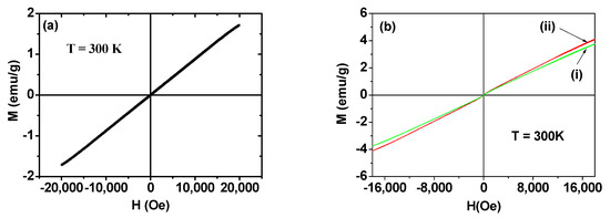 (a) M–H curve of Gd2O3 nanoparticles at T = 300 K [41]. (b) M–H curves of Ln2O3 nanoparticles, Ln = (i) Tb and (ii) Ho at T = 300 K [43]. Net M values of Ln2O3 nanoparticles without ligands were used in the plots. Adapted from [41,43]. Copyrights 2020 and 2021 MDPI.