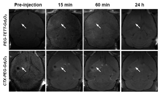 Gu et al. developed a mouse brain tumor-targeting contrast agent using CTX as a tumor-targeting ligand [45]. CTX is a peptide consisting of a 36-amino acid sequence found in the venom of the deathstalker scorpion [69]. CTX preferentially binds to glioma cells, enabling the development of therapeutic and diagnostic protocols for several types of tumors [70]. In this study, CTX-PEG-TETT-coated Gd2O3 nanoparticles with a core diameter of 3.46 nm and r1 value of 8.41 s−1 mM−1 at 7.0 T were applied to tumor-targeting imaging in vivo. Figure 10 shows a series of in vivo T1 MR images of mice with brain glioma tumor after mice tail intravenous injection of PEG-TETT-Gd2O3 and CTX-PEG-TETT-Gd2O3 nanoparticle samples at the same Gd dose (6 mg Gd/kg). The PEG-TETT-Gd2O3 nanoparticles slightly improved the contrast of glioma sites (labeled with arrows) compared with the preinjection image. However, the CTX-PEG-TETT-Gd2O3 nanoparticles exhibited highly enhanced T1 MR images in brain tumors (labeled with arrows) after injection, clearly supporting that the CTX-PEG-TETT-Gd2O3 nanoparticles act as a tumor-targeting T1 MRI contrast agent.