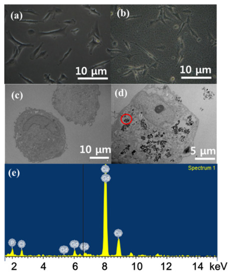 Optical microscope images of U87MG tumor cells incubated (a) without and (b) with cRGD-Gd2O3 nanoparticles. HRTEM images of U87MG tumor cells incubated (c) without and (d) with cRGD-Gd2O3 nanoparticles. (e) EDX spectrum of the circled region in (d). Adapted from [47]. Copyright 2018 Wiley.