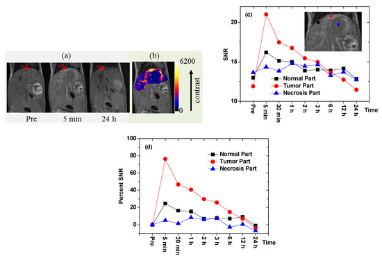 To demonstrate the occurrence of in vivo tumor targeting via T1 MRI, a sample solution containing cRGD-Gd2O3 nanoparticles was injected into the tail vein of a U87MG tumor-bearing mouse inoculated into the liver (injection dose = ~0.1 mmol Gd/kg) [47]. T1 MR images were obtained before and after injection (Figure 12a). As shown in the figure, tumor targeting was confirmed via positive contrast enhancement in the liver tumor 5 min after injection, indicating the accumulation of the nanoparticles in the tumor. Figure 12b shows a color map of the middle T1 MR image depicted in Figure 12a, in which the contrast enhancement in the liver tumor (i.e., the widely spread brighter part) can be clearly observed. The signal-to-noise ratios (SNRs) of the three regions of interest (ROIs) in the liver, i.e., the normal region (filled square), the tumor region (filled circle), and the necrotic region (filled triangle), as labeled in the inserted T1 MR image, are plotted versus time in Figure 12c. The T1 contrast enhancement in the liver tumor was approximately three times higher than in the normal region of the liver, as shown in the percentage SNR plots in Figure 12d. These results suggest that the cRGD-Gd2O3 nanoparticles act as a tumor-targeting T1 MRI contrast agent.