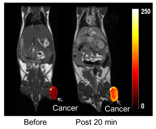 T1 MR images before and 20 min after (labeled “post 20 min”) intravenous injection into the mouse tail: the bright contrast at the tumor (labeled with arrows) was due to the accumulation of nanoparticles at the tumor site. Adapted from [44]. Copyright 2020 The Royal Society of Chemistry.