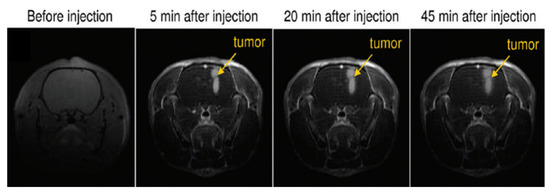 T1-weighted images of the brain of a rat having intracerebral 9L gliosarcoma (9LGS) before and after (5, 20, and 45 min) intravenous injection of gadolinium-based nanoparticles. Adapted from [76]. Copyright 2011 American Chemical Society.