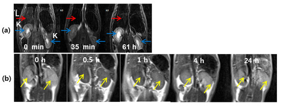 (a) A series of 3.0 T in vivo T2 MR images: coronal views of kidneys and liver (labeled as “K” and “L”, respectively) before and after intravenous injection of an aqueous solution of D-glucuronic acid-coated Dy2O3 nanoparticles into the mouse tail [79]. (b) In vivo coronal 3.0 T T2 MR images of the mice kidneys (indicated with arrows) as a function of time before and after intravenous injection of an aqueous solution of carbon-coated Dy2O3 nanoparticles into the mouse tail [80]. Adapted from [79,80]. Copyrights 2012 Elsevier and 2020 MDPI.