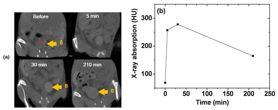 Lanthanide elements exhibit higher X-ray attenuation coefficients [16] than iodine, which is currently used as a CT contrast agent in its organic molecular forms. Consequently, Ln2O3 nanoparticles can be applied as CT contrast agents [17,18,81,82]. For example, an aqueous solution of Gd2O3 nanoparticles coated with iodine compounds was used to investigate CT imaging in vivo [81]. Brighter contrast enhancements were observed in mouse bladder (labeled B in Figure 16a) after intravenous tail injection. The X-ray absorption in the ROI of the bladder (indicated by a small, dotted circle in Figure 16a) indicated that the contrast reached a maximum at ~30 min after injection and then decreased with time (Figure 16b), suggesting that the sample solution was excreted through the bladder as urine. This result showed that an aqueous solution of Gd2O3 nanoparticles might serve as a CT contrast agent.