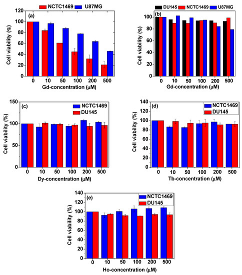 In vitro cytotoxicities of (a) uncoated Gd2O3 nanoparticles in NCTC1469 and U87MG cell lines and (b) PAA-coated Gd2O3 nanoparticles in DU145, NCTC1469, and U87MG cell lines [83]. PAA-coated Ln2O3 nanoparticles (Ln = (c) Dy, (d) Tb, and (e) Ho) in DU145 and NCTC1469 cell lines [42,43]. Adapted from [42,43,83]. Copyrights 2018, 2020 and 2021 The Royal Society of Chemistry, Wiley & MDPI.