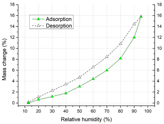 The sorption and desorption kinetics of water vapor applied to a sample of the investigated material were measured using a gravimetric fully automated Aquadyne DVS dynamic vapor sorption device (Quantachrome Instrumens, Hartley Wintney, UK). The measurements were performed at a constant temperature of 22.5 °C. Microcrystalline cellulose CRM 302 MCC was used as a standard for the device calibration. A sample of a defined weight of 45 mg was placed on analytical balance in the instrument, then a re-testing process was started, where the sample was cyclically exposed to changes in relative humidity and the dependence of the change in weight of the examined material on ambient humidity was measured. When the humidity limit is reached, the humidity increase cycle stops and the desorption process begins. The output of the measurement is the dependence between the change in the weight of the examined sample and the relative humidity for the adsorption and desorption process. The actual moisture of the powder was analyzed using a moisture analyzer MB 60 (VWR, Lutterworth, UK).