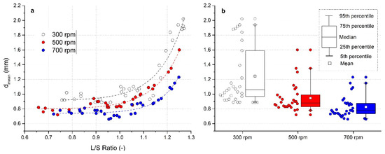 The width of the granule size distribution decreased as the impeller speed increased; it was the narrowest at a speed of 700 rpm (Figure 4b). Mean granule size from all experiments, analyzed by box charts at an impeller speed 700 rpm was dmean = 0.826 mm. At an impeller speed of 300 rpm it was up to 1.244 mm. Since some of the experiments are located in the area of L/S < 1, where the growth of the granules was not so significantly affected by the amount of added liquid, the median of the distribution curve was 1.06 mm (300 rpm), 0.88 mm (500 rpm), and 0.78 mm (700 rpm).