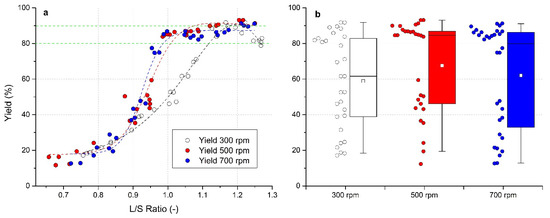 Evaluation of yield fraction (0.4–3 mm) for impeller speeds of 300, 500, and 700 rpm: (a) effect of the L/S ratio on yield fraction, green lines indicate yield interval from 80 to 90%, (b) box charts of yield fraction for different impeller speeds.