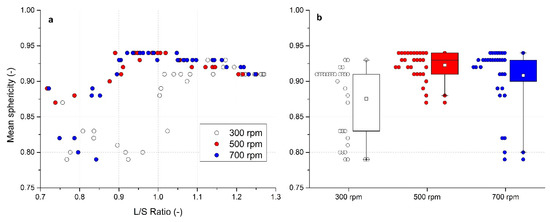Evaluation of mean sphericity for impeller speeds of 300, 500 and 700 rpm: (a) effect of the L/S ratio on sphericity, (b) box charts of sphericity for different impeller speeds.