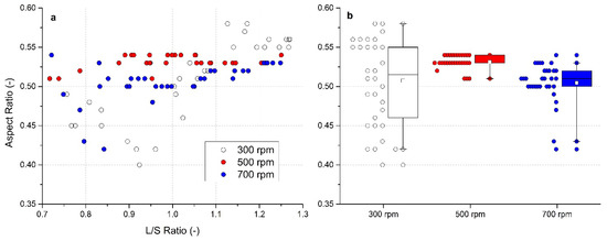 Evaluation of the aspect ratio for impeller speeds of 300, 500, and 700 rpm: (a) effect of the L/S ratio on aspect ratio, (b) box charts of aspect ratio for different impeller speeds.
