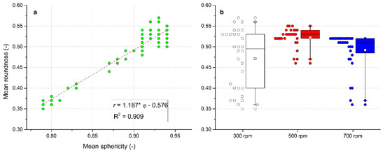 Evaluation of mean roundness. (a) Mean roundness relationship on mean sphericity, (b) box charts of mean roundness for impeller speeds 300, 500, and 700 rpm.