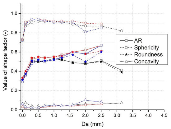 As discussed above, granulometric parameters of the produced granules were influenced by the L/S ratio and the impeller speed used. Apart from these process parameters, the actual values of shape factors depended also on the actual size of the individual granules in the batch. The graphical dependence of investigated shape factors on the area equivalent diameter Da at the L/S ratio = 1.0 is summarized in Figure 10.