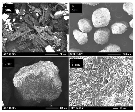 The raw particles of Avicel PH101 were analyzed by electron microscopy using the SED method at 500× magnification; the rod-shaped particles are shown in Figure 11a. In order to illustrate granulometric parameters of the prepared granules, those formed at L/S ratio = 1.0 and an impeller speed of 700 rpm are chosen. Figure 11b shows the smooth surface, rounded spherically shaped (φ = 0.94) granules. It can be seen that the characteristic dimensions of the granules are not the same in all directions, which confirms the lower AR values. A more detailed view of the granule from this batch can be found in Figure 11c, where asperities (c = 0.022) on the surface at 250× magnification are visible. In detail, the raw rod-shaped particles of Avicel PH101 can be recognized on the surface of the granules in Figure 11d. A similar morphology of granules can be found in the work of Mahdi et al. [67]. Shi et al. [68] proved that the final shape of the granules can also be influenced by the process time of wet massing.