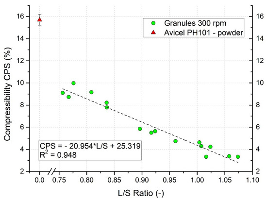 A FT4 powder rheometer (Freeman Technology, Tewkesbury, UK) was used to determine the compressibility of Avicel powder and granules in accordance with ASTM-D7891-15 (2015) standard [53]. The batch of experimental material for one measurement was 60 g for Avicel powder and 80 g for granules. Compressibility measurements were performed in two vessels with a diameter of 50 mm and a volume of 85 mL. Prior to the compressibility measurement itself, the sample was subjected to three conditioning cycles, using a blade, in order to obtain a homogeneously packed powder bed. Excess material was split to achieve a defined bottom vessel volume 85 mL. Normal stress in a range of 0.5–15 kPa was applied to the pretreated sample. Based on the position of the piston, the height occupied by the test material before and after the compression test was determined and the volume of material was calculated using the vessel geometry and the measured heights. Compressibility (CPS) is calculated from the change in volume of the tested sample after compression, expressed as a percentage [54]. Despite the fact that compressibility is not a direct indicator of flow properties, it is related to several operations such as storage in hoppers or the behavior of bulk materials during roller compaction [55].