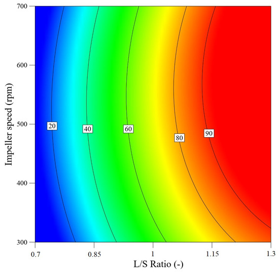 Similarly, the experimental data was processed in order to predict the process yield; the model is shown in Figure 14. In this graph, the transition between the individual areas of the process yield is significantly smoother. A significant part of the graph is the area with a yield of more than 80% shown in orange to red color. As a result, the process parameters of the impeller speed and L/S ratio can be optimally set in order to obtain a defined process yield.