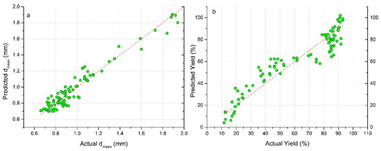 Relationships between experimental and predicted data: (a) model for prediction of mean granule size, (b) model for prediction of process yield.