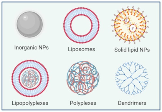 The majority of approved vectors for gene therapy currently applied in clinical protocols are viral vectors due to their high transfection efficiency [37]. Viruses such as retroviruses, lentiviruses (as HIV), adenoviruses and adeno-associated viruses can be diverted as gene delivery systems by the replacement of part of viral genome with a therapeutic gene [38]. However, limitations of viral vector delivery systems such as immunogenicity and mutagenicity could restrict their clinical application [4,39,40]. These limitations have prompted the development of non-viral gene carriers using different materials (lipid-based nanoparticles (NPs), polymer-based carriers and inorganic NPs) (Figure 1). Those non-viral carriers have considerable advantages compared to viral vectors such as relatively low immunogenicity, low cost and versatility. Those carriers can accommodate nucleic acids with large size and they can be more easily functionalized with specific ligands allowing their targeting to a given organ or cell type. The choice of the appropriate carrier is influenced by the route of administration and therapeutic objectives [41].