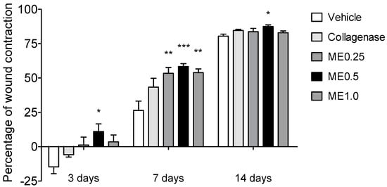 Percentage of skin wound contraction at the back of rats after 3, 7, or 14 days of treatment with vehicle, collagenase cream, ME.025, ME0.5, or ME1.0. ANOVA, Dunnett’s test; * p < 0.05, ** p < 0.01, *** p < 0.001.