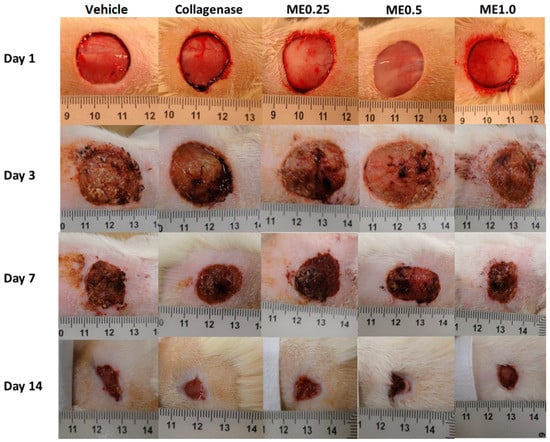 Skin wounds at the moment they were performed and after 3, 7, or 14 days of treatment with vehicle, collagenase cream, ME.025, ME0.5, or ME1.0.