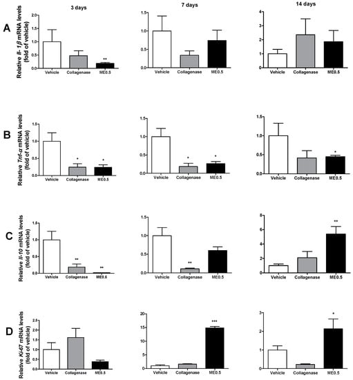 Levels of Il-1β (A), TNF-α (B), IL-10 (C), and Ki-67 (D) mRNA expression in skin wounds after 3, 7, or 14 days of treatment with vehicle, collagenase cream, or ME0.5. ANOVA, Dunnett’s test; * p < 0.05, ** p < 0.01, *** p < 0.001.