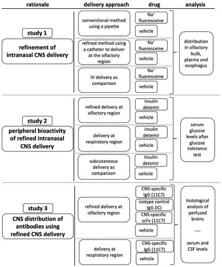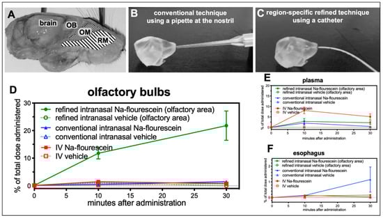 Maigler F, Ladel S, Flamm J, Gänger S, Kurpiers B, Kiderlen S, Völk R, Hamp C, Hartung S, Spiegel S, et al. Selective CNS Targeting and Distribution with a Refined Region-Specific Intranasal Delivery Technique via the Olfactory Mucosa. Pharmaceutics. 2021; 13(11):1904. https://doi.org/10.3390/pharmaceutics13111904
